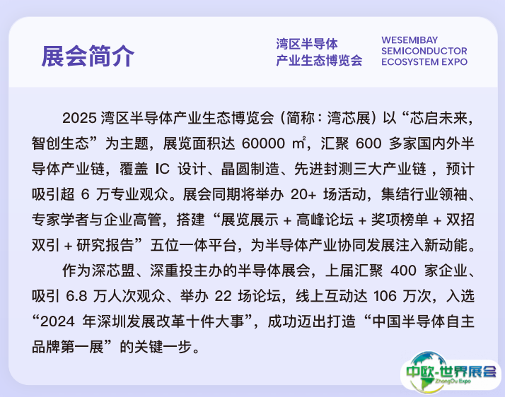 湾区半导体产业生态博览会(简称:湾芯展)以“芯启未来,智创生态”为主题,展览面积达60000㎡,汇聚600多家国内外半导体产业链头部企业,覆盖IC设计、晶圆制造、先进封测三大产业链 ,预计吸引超6万专业观众。展会同期将举办20+场活动,集结行业领袖、专家学者与企业高管,搭建“展览展示+高峰论坛+奖项榜单+双招双引+研究报告”五位一体平台,为半导体产业协同发展注入新动能。