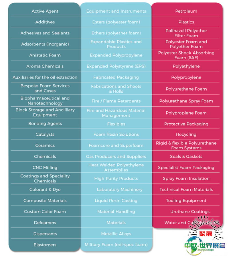所有这些都为泡沫生产商提供一个单一市场,能够借此与整个供应链条以及当前和潜在的买家会面。美国诺维聚氨酯发泡材料展览会(Foam Expo North America)将重点展示来自多个行业的最新产品应用、服务和设备包括:粘合剂和密封剂、转换和制造、设备和机械、泡沫制造、原材料,从以下行业垂直领域:航空航天、汽车、建筑、医疗、包装等。