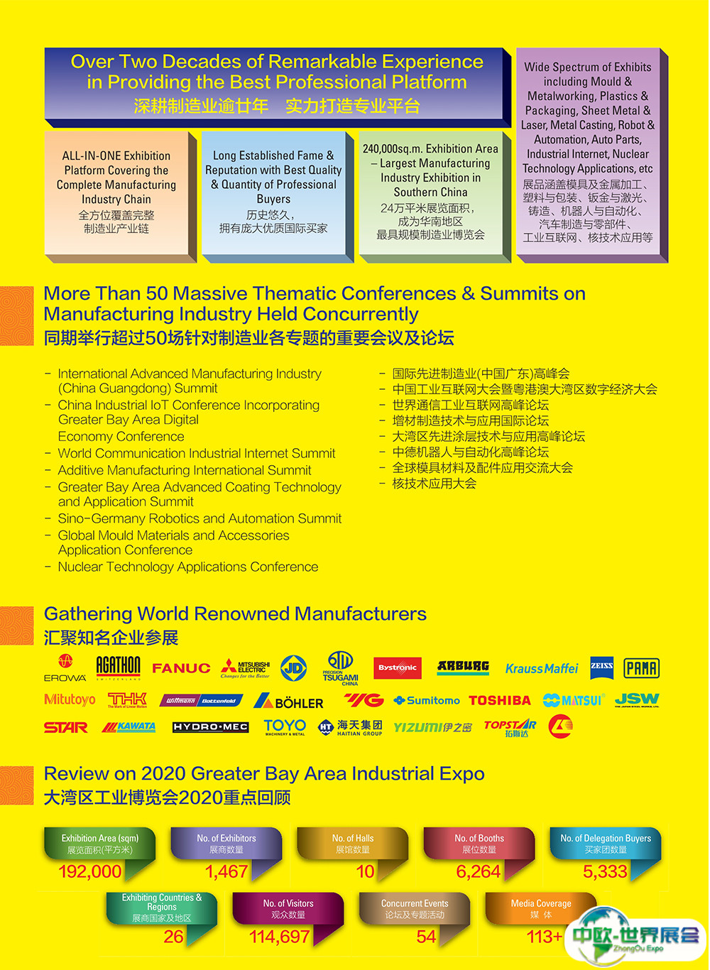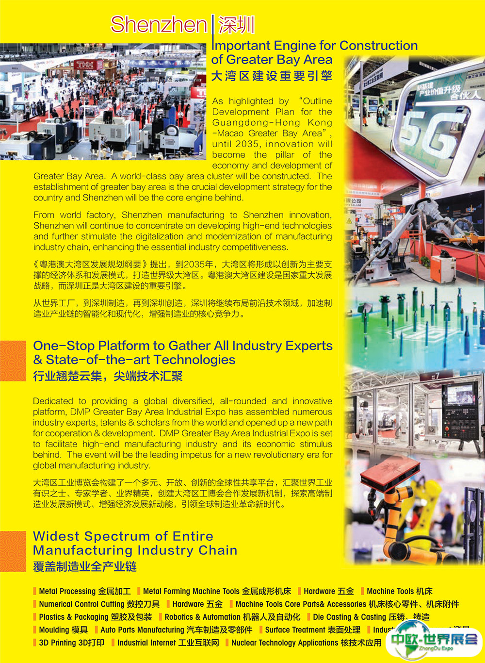 模具及金属加工展:模具制造机械;金属加工设备、合金、钢材及其它原材料;机器人及智能装备;节能产品、工厂物料、物流及仓储、表面处理及涂料、精密量度及检测仪