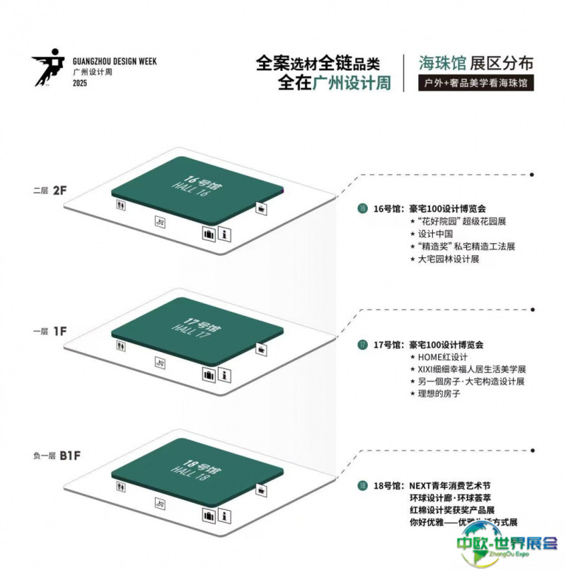 涵盖人居空间全案所需“外装-内装-后装”的超全供应链和服务链,包含:“户外花园庭院—精造工法技艺—智装风水电气—面层装饰材料—入户安防门窗—全屋定制家居—全屋家具—软装灯光—家居用品—艺术信物—家政服务—优雅生活方式”的人居全案选材全链品类,分类设置于保利馆+国采馆+海珠馆,形成“高定+材料美学看保利馆、软装+生活美学看国采馆、户外+奢品美学看海珠馆”的展会格局,逐步完善“全案选材全链品类全在广州设计周”的展会平台构建,为全案设计选材选品搭建一站式营商互动平台。