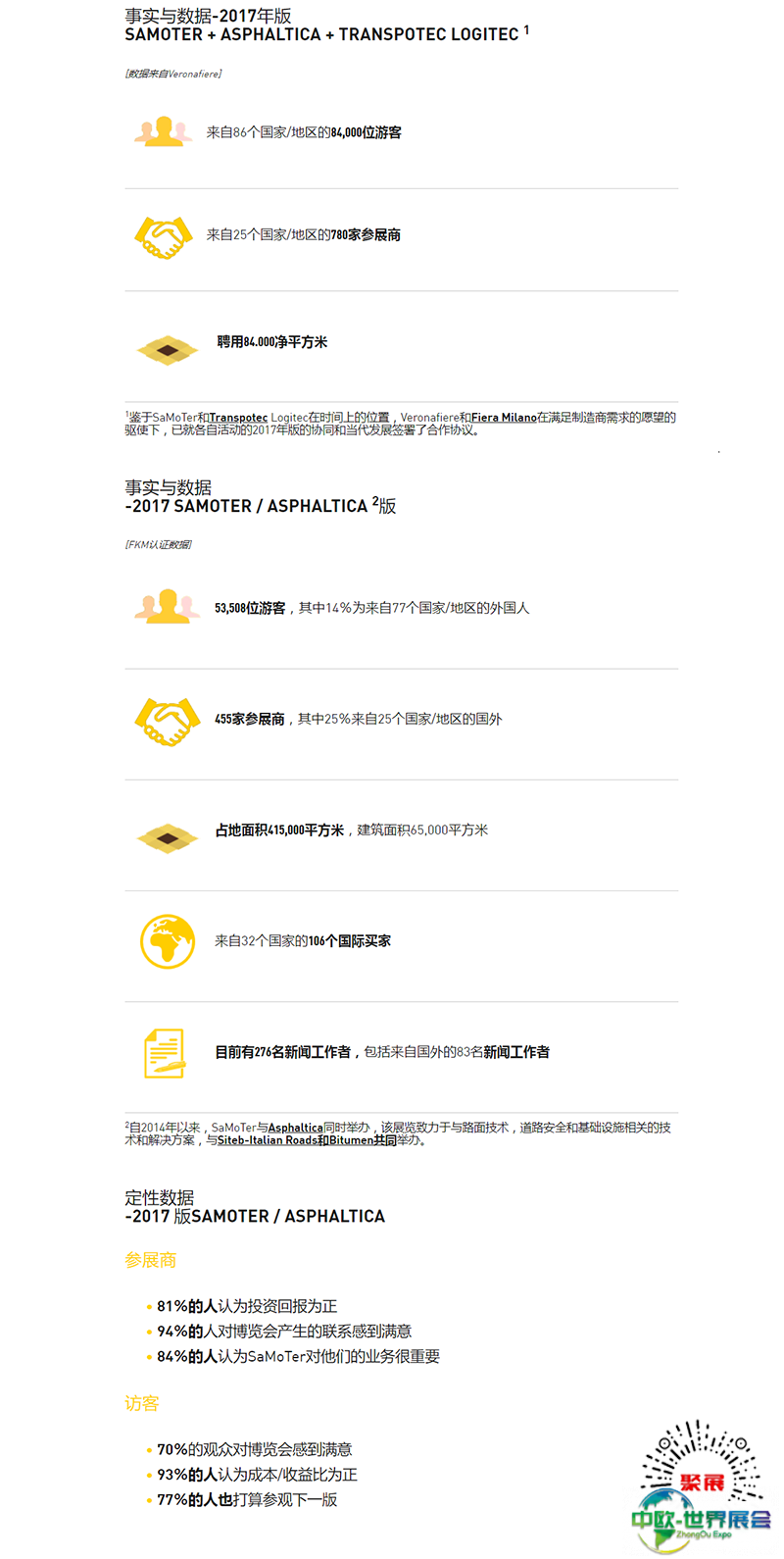 意大利维罗纳工程机械、高空作业机械展览会(SAMOTER)上届展会总面积118000平方米,参展企业909家均来自中国、德国、法国、英国、俄罗斯、捷克、西班牙、巴西、印度等,参展人数达98048人。