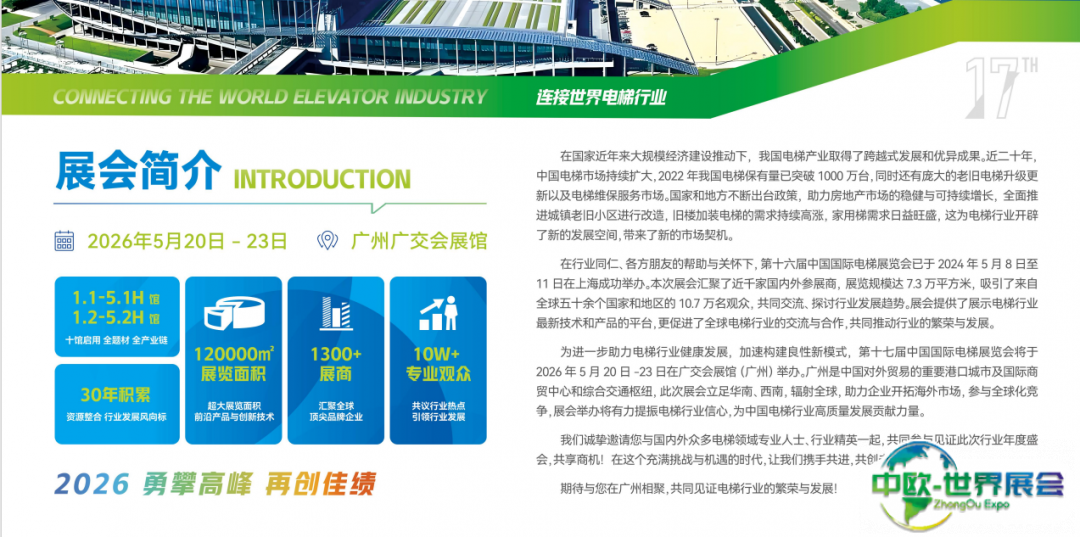 中国国际电梯展览会(WEE EXPO)是世界电梯行业重要的盛会之一,旨在为全球电梯制造商、供应商与客户提供一个共同交流的平台,展示最新技术和产品。届时,您将有机会结识各类来自不同国家和地区的专业人士,并深入了解行业发展趋势,掌握最新技术应用。