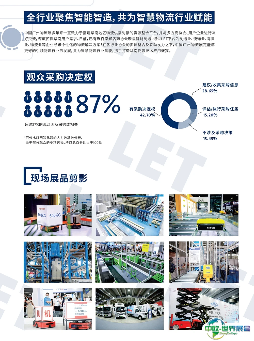 物流集成与信息化展区:物流集成、物流系统、内部与运输物流的应用软件与解决方案、自动识别等;搬运设备、叉车及配件、起重机及配件、agv自动导引车、机器人本体及配件、升降平台、电梯及附件、输送车、输送系统等;电商物流展区、电商物流系统集成、电商、快递仓储管理技术及设备等