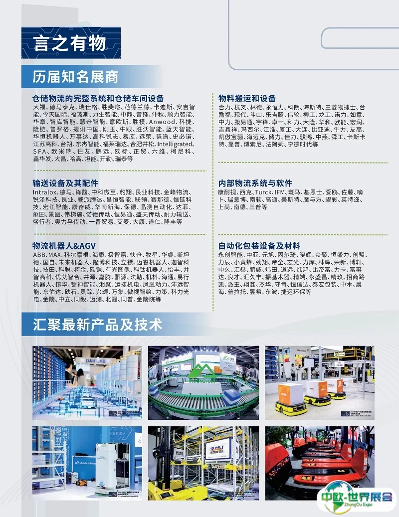 仓储与车间物流设备展区:仓储系统、货架系统、机器人、工厂、车间设备、托盘、周转箱、物流配套件、物流集装单元器具、工业门、清洁设备等