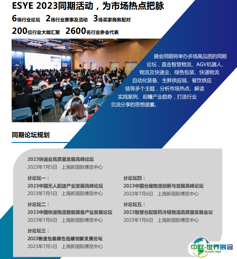 ESYE CHINA 2023由上海市邮政管理局、中国快递协会指导,中国仓储与配送协会支持,上海市快递行业协会、上海市仓储与配送行业协会、上海物流协会、上海现代服务业联合会物流与供应链服务专业委员联合主办。