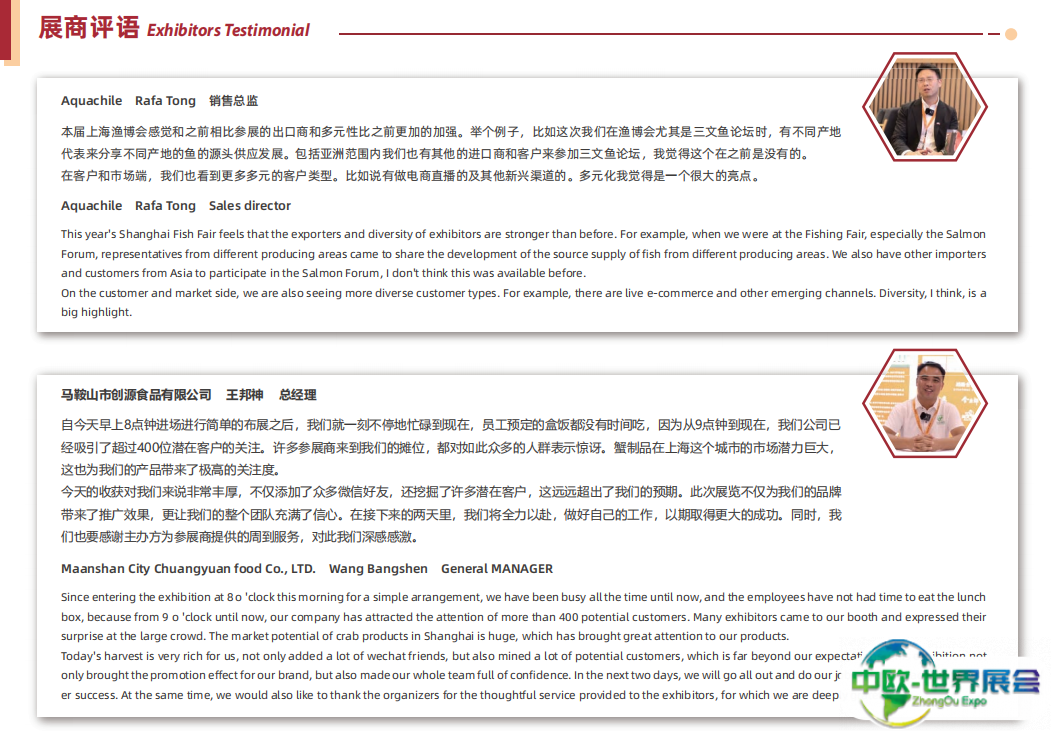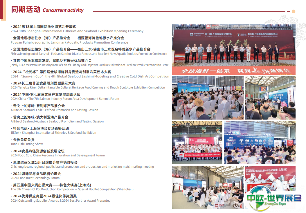 上海国际渔业展-上海渔博会(World Seafood Shanghai)携手上海国际餐饮食材展同期举办,聚拢水产和餐饮核心资源及前沿趋势,以市场需求为导向,紧跟行业步伐,打造集水产海鲜、加工生产、渔业服务、水产养殖等于一体的综合类全球水产商贸平台,助力企业拓展全球贸易新空间。