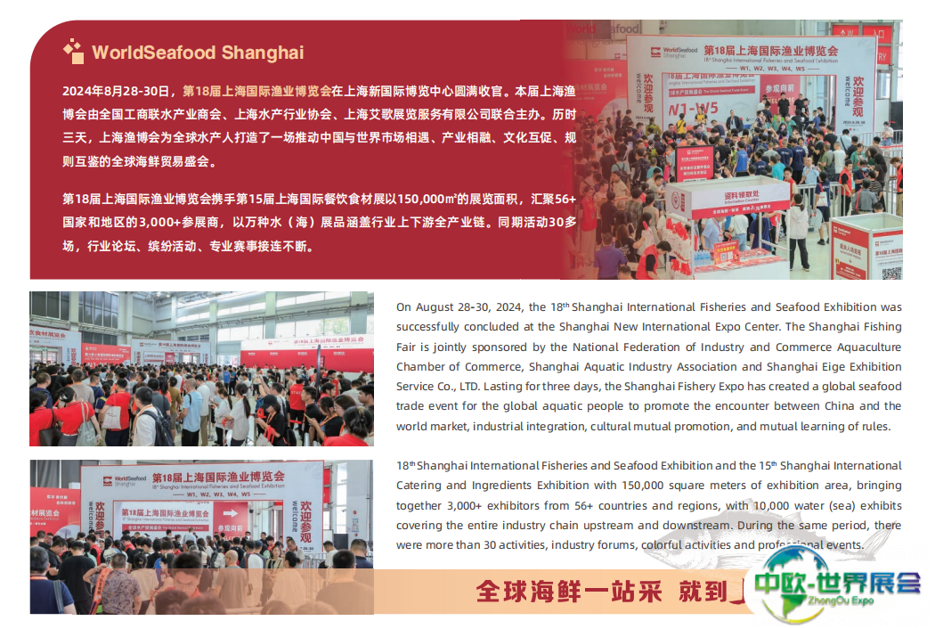 上海国际渔业展-上海渔博会(World Seafood Shanghai)全球海鲜一站式采购平台。多年来积累了覆盖全球超过73个国家和地区的庞大参展商与专业观众资源库,汇聚全产业链上中下游企业,实现产品与渠道无缝衔接,助力企业降本增效、拓展市场,驱动产业迈向新高度。
