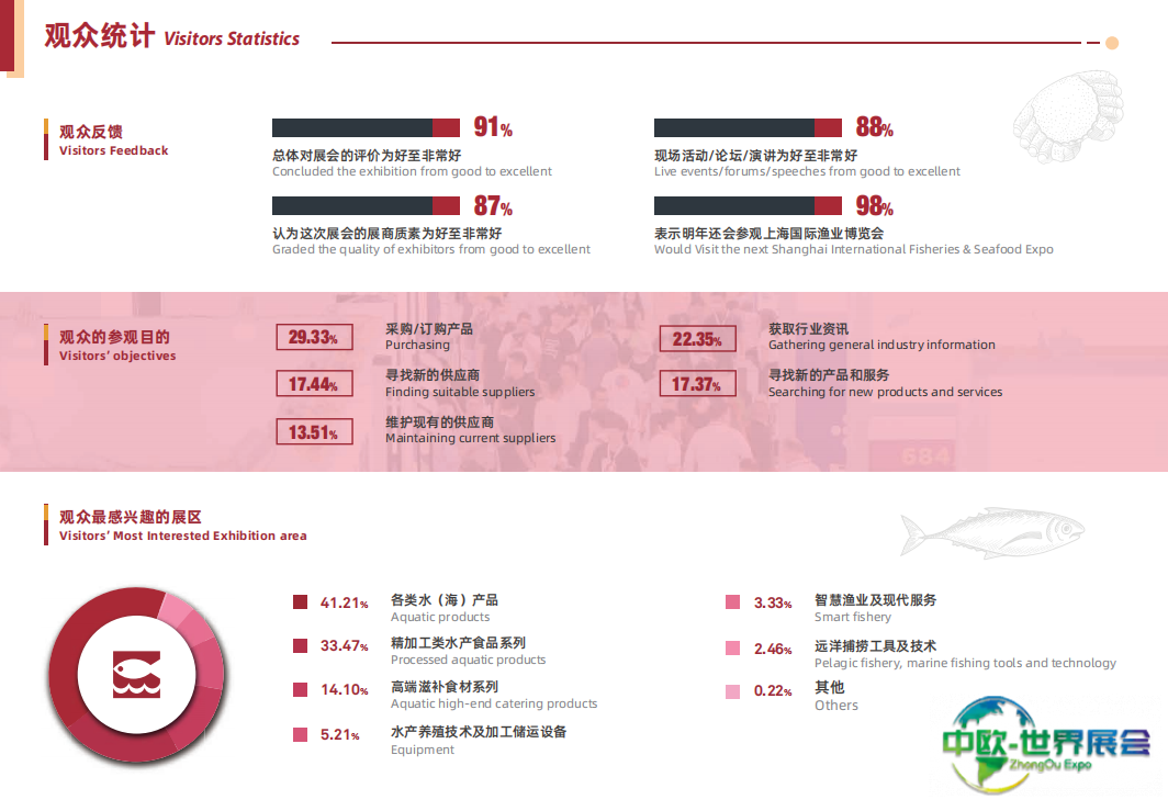 上海国际渔业展-上海渔博会(World Seafood Shanghai)携手上海国际餐饮食材展同期举办,聚拢水产和餐饮核心资源及前沿趋势,以市场需求为导向,紧跟行业步伐,打造集水产海鲜、加工生产、渔业服务、水产养殖等于一体的综合类全球水产商贸平台,助力企业拓展全球贸易新空间。