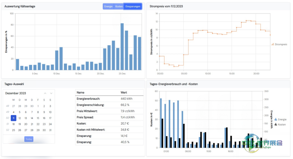 除商品价格优化外,该系统还能通过电网费用优化实现节能。“我们正开始将柔性调节能力拓展至日内市场等其他电力交易领域,”他补充道。原则上,平衡电力市场可作为额外收益来源。能源柔性调节能力主要取决于设施规模与托盘位数。“通常每个制冷系统可转移数百千瓦负荷,最长可持续5小时,”威尔克介绍道。