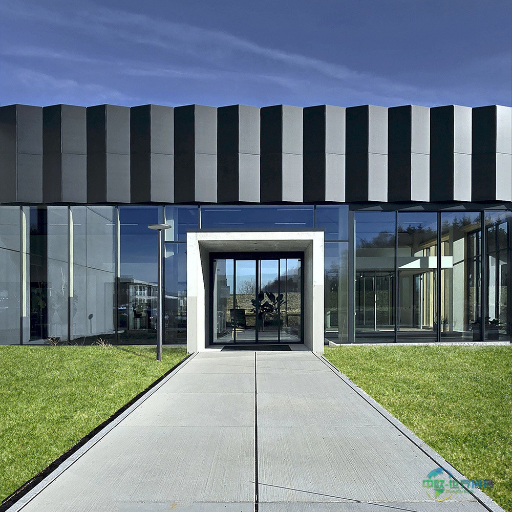 该设计基于建筑群的南北朝向,使得光伏组件(145千瓦)得以安装在朝西和朝东的立面上。通过将面板以142度角相互对置,光伏有效面积增加了7%。无框哑光光伏模块从立面凸起,使建筑显得更短且更具“活力”。根据太阳位置的变化,立面设计可呈现出韵律感或平整均匀的效果。