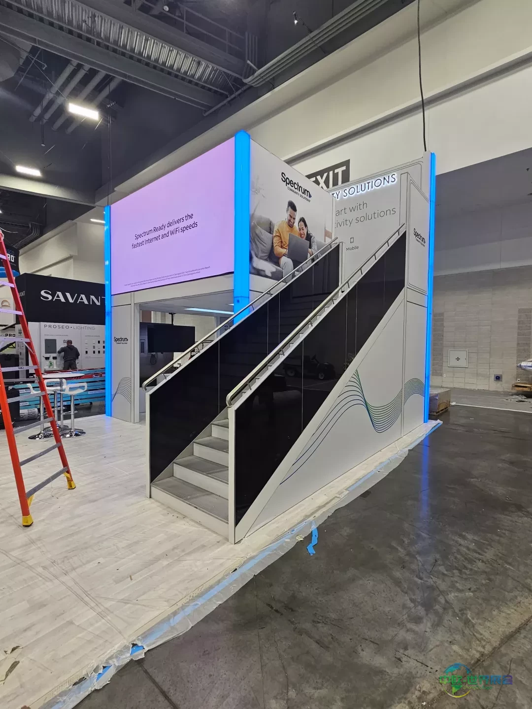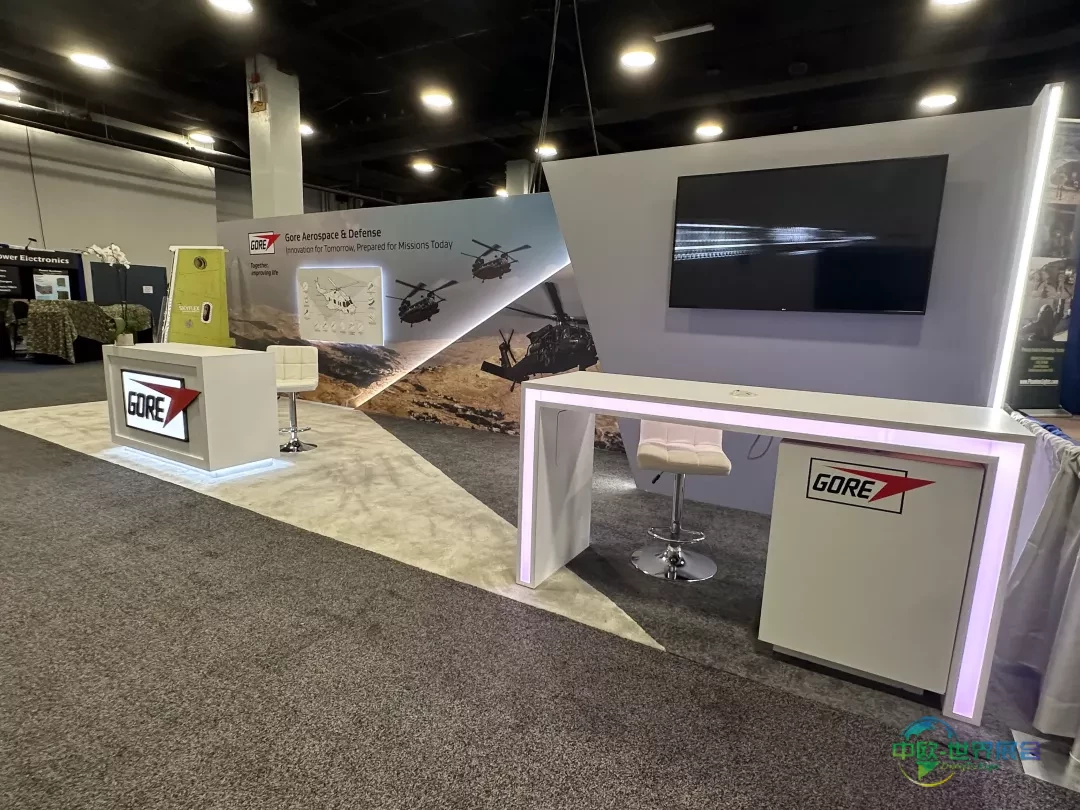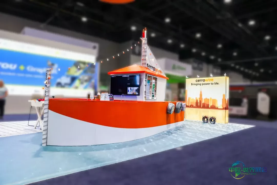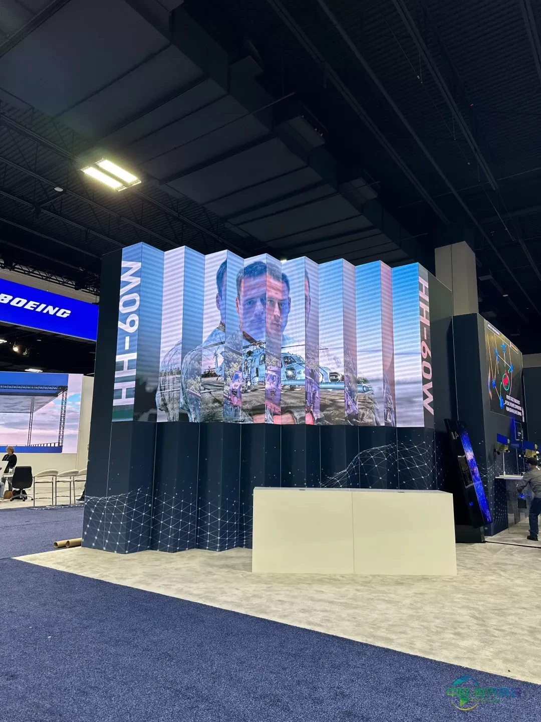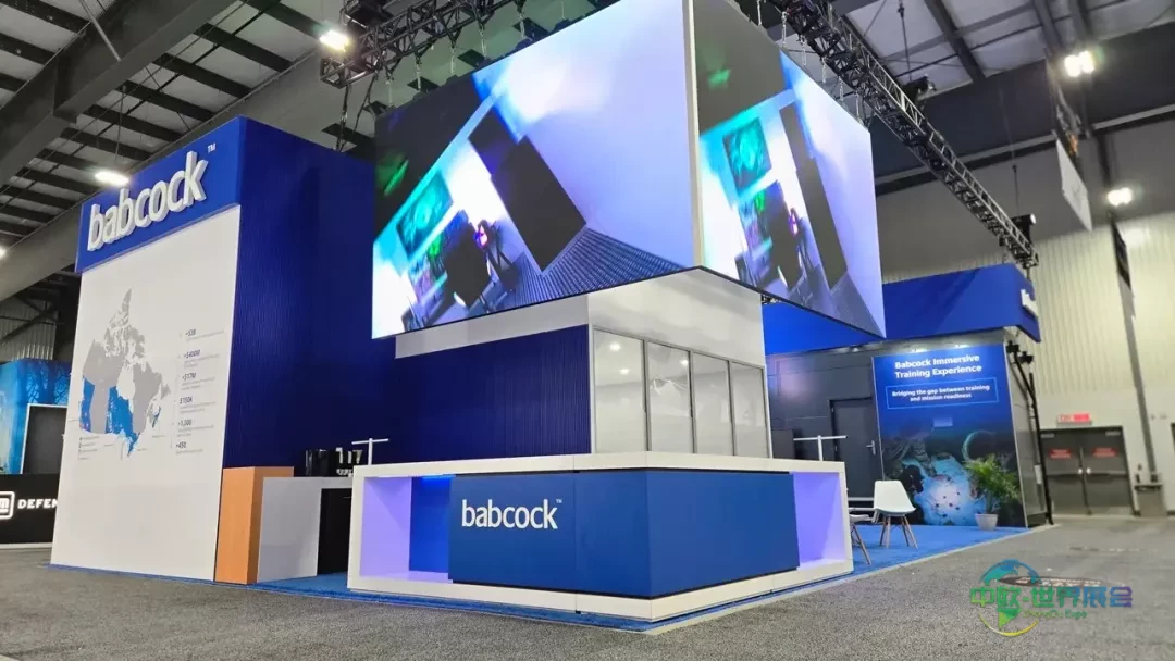 Babcock展台采用大型岛式布局,四面呈现简洁线条与鲜明品牌标识。悬浮LED立方体作为结构核心提供动态地面投影,屏幕下方设置封闭会议室,开放式柜台引导访客流线,在明确边界内实现规模、可视性与功能的平衡。