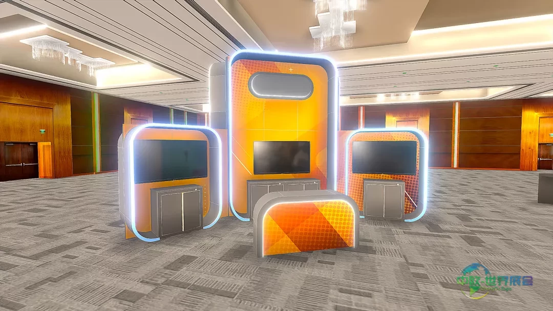 展台采用弧形排列的垂直LEDskin面板群组,屏幕通高影像内容覆盖结构多面体。实体基座支撑LED单元并固定展位边界,双侧通道设计实现展场多角度可视性。
