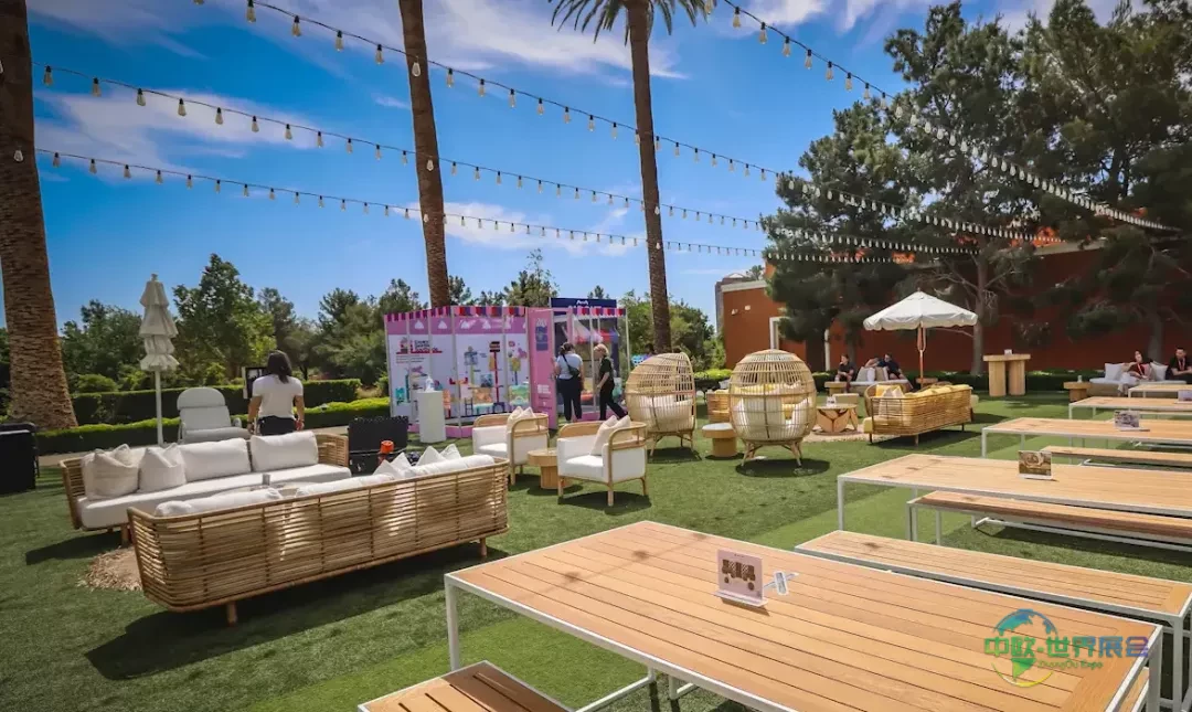 春季市集在草坪环境中打造开放式活动空间,模块化桌椅组合形成清晰聚集区域。上空串灯界定空间范围,设计融合棕榈树与现有景观,宽阔步道保障全域流畅通行与休闲互动。
