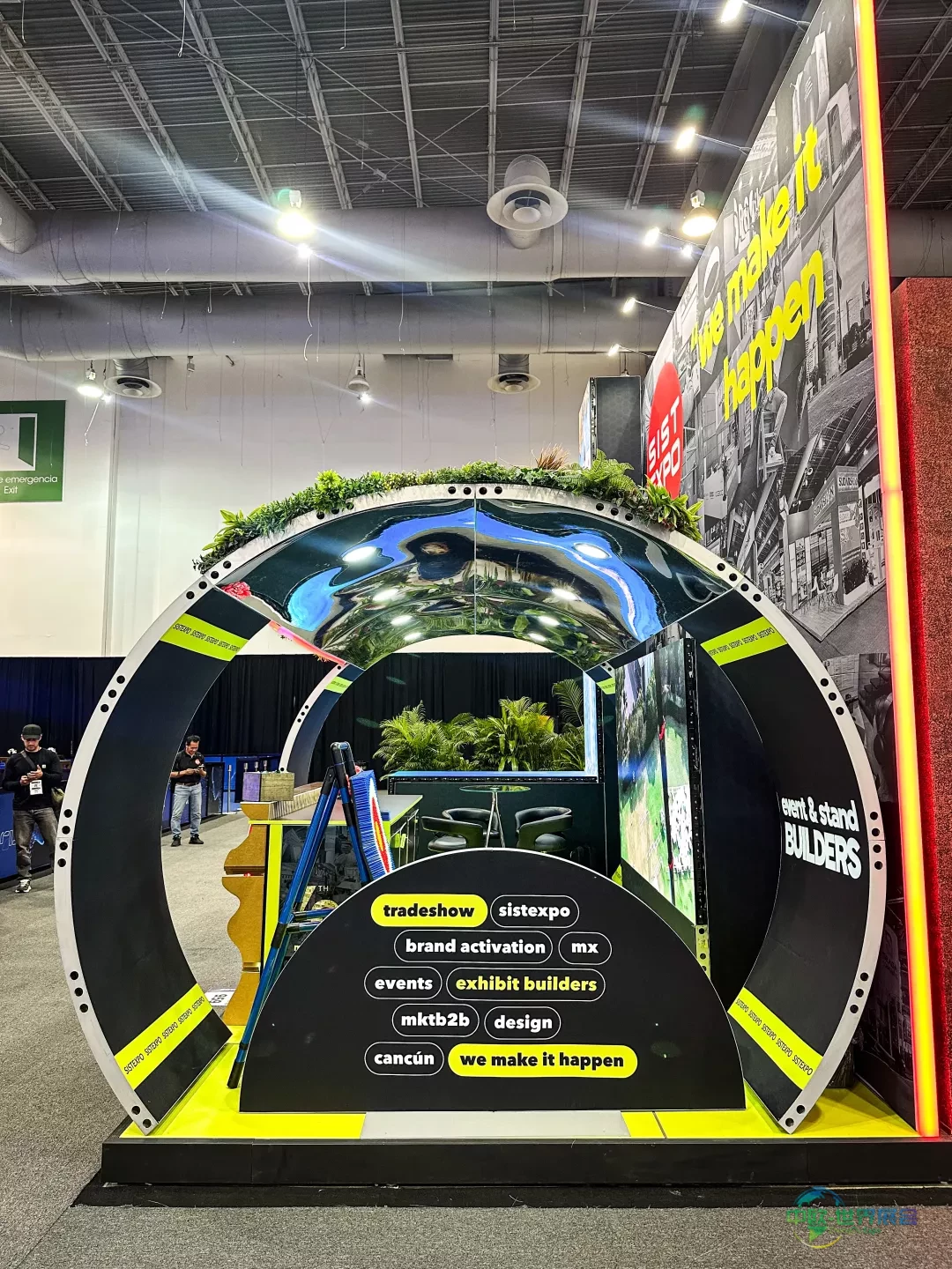 展台核心为环形框架构建的可穿行圆形结构,既形成明确进出通道,又围合出配备座椅与绿植的内部洽谈区。垂直图像展板环绕外立面,集成照明突显弧形轮廓,前后开放设计保持通道对内部空间的可见度。