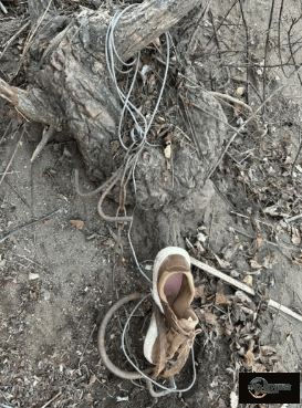 任先生向记者描述,这个捕兽夹带有锯齿状的咬合齿和强力的弹簧装置,是用来捕捉大型野生动物的工具,咬合力非常惊人,夹子上当时还残留着一些动物毛发。“我使尽全身力气掰了好几分钟都没能掰开,越用力挣扎,夹子反而咬得越紧,那一刻真的感到特别无助。”紧急关头,任先生拼命撑开夹子边缘,硬是把左脚从鞋子里拽了出来,就在脚抽离的瞬间,鞋子被夹子的锯齿完全刺穿。多亏了鞋底厚实且反应迅速,他的脚并没有遭受重创。