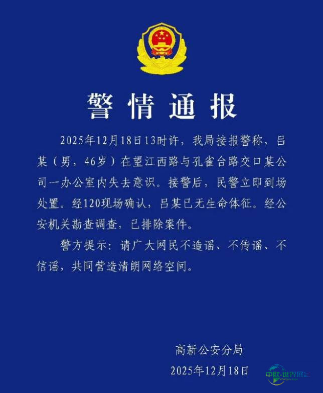 2025年12月18日13时左右,我局接到报警,称吕某(男性,46岁)在望江西路与孔雀台路交叉口附近某公司办公室内失去知觉。接报后,民警迅速赶赴现场处理。经120急救人员现场确认,吕某已无生命迹象。经过公安机关现场勘查和调查,目前已排除案件可能。