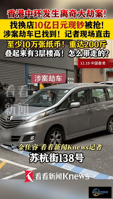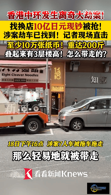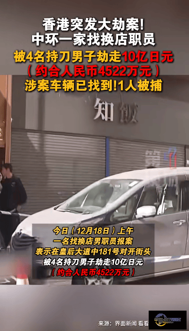 根据看看新闻报道,12月18日,香港中环一家货币兑换店的员工遭遇4名男子持刀抢劫,损失了10亿日元现金(约合4500万元人民币)。警方目前已逮捕一名男子,怀疑用于接应劫匪逃离的车辆也被寻获。