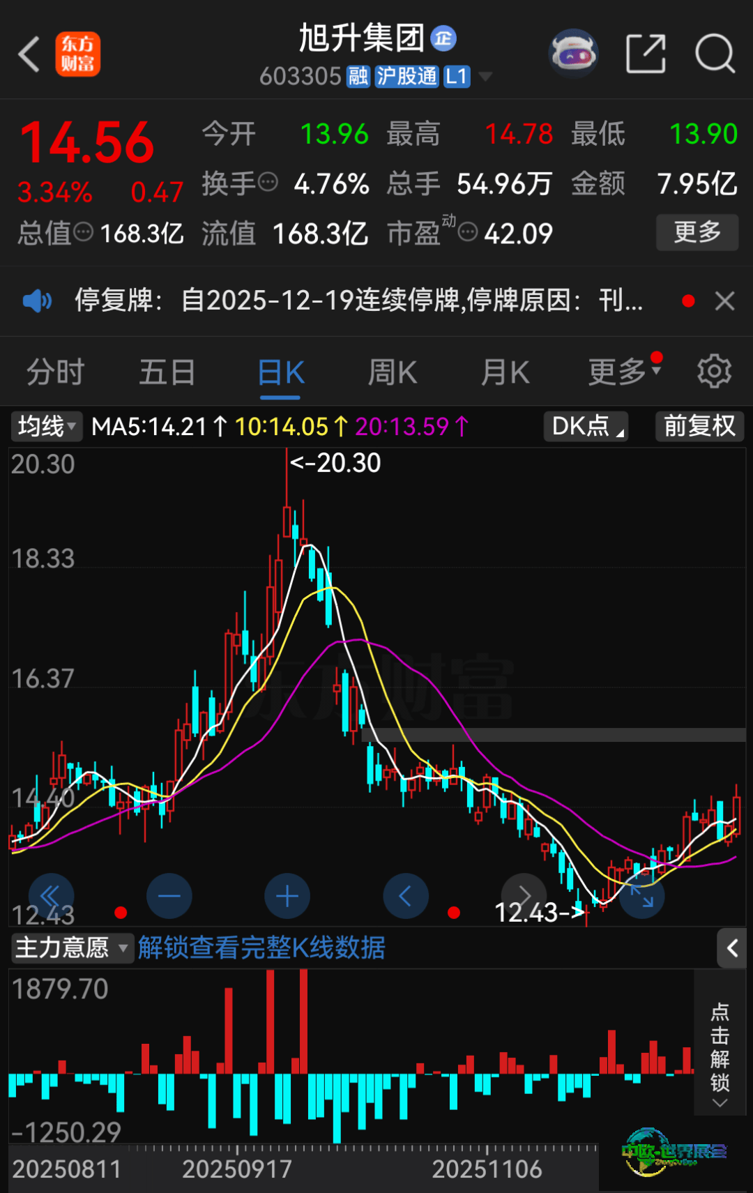 旭升集团决定从12月19日开市起暂停股票交易,预计停牌时长不超过两个交易日。截至12月18日收盘,该公司股价为14.56元每股,总市值达到168.3亿元。