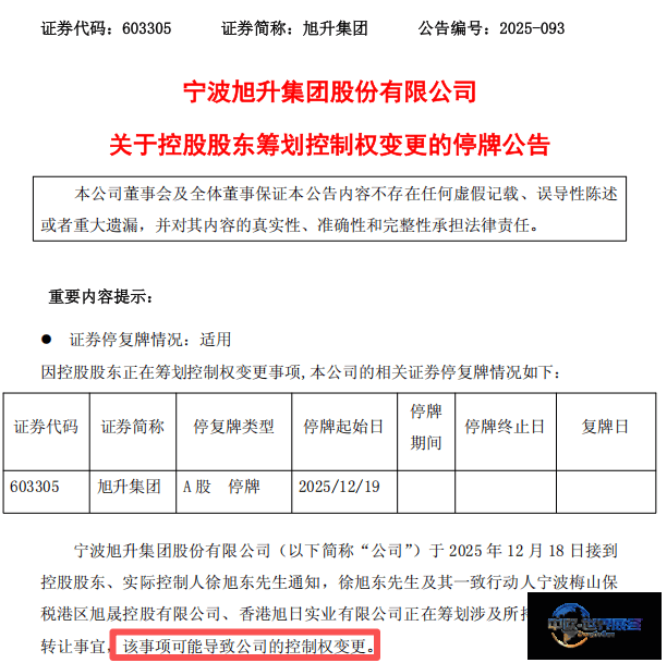 【导读】旭升集团大股东正计划进行控制权转让,公司股票自12月19日开市起暂停交易