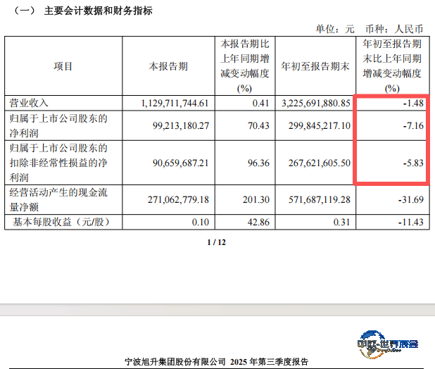 不过,旭升集团在2025年第三季度的业绩有所回暖,营业收入与归母净利润同比分别增长了0.41%和70.43%。
