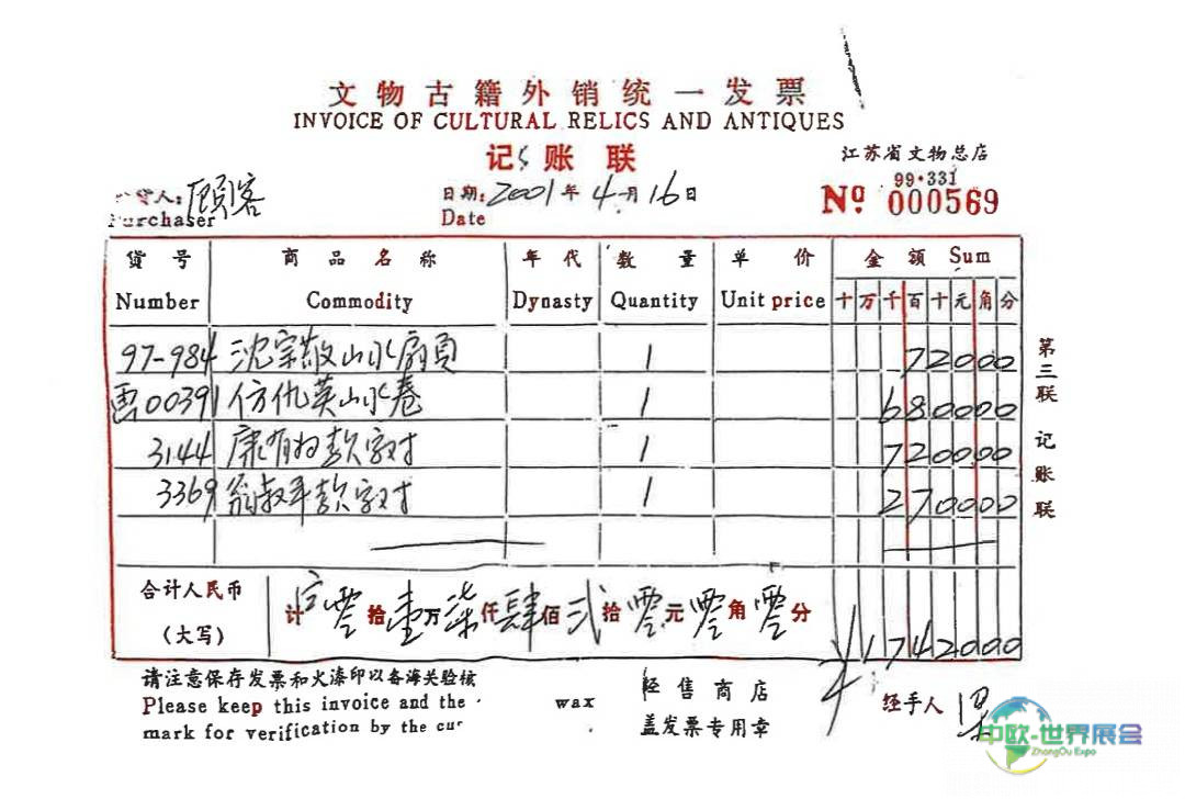 原江苏省文物总店销售发票显示,《仿仇英山水卷》于2001年4月16日被“顾客”以6800元价格购买。(受访者供图)