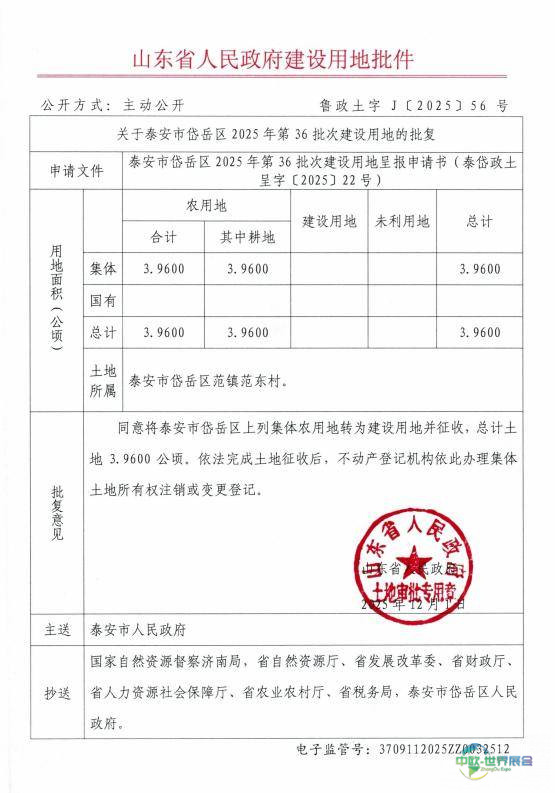 山东省人民政府通过《关于泰安市岱岳区2025年第36批次建设用地的批复》(鲁政土字J〔2025〕56号)文件,批准征收土地面积为3.96公顷(详见本公告附件).