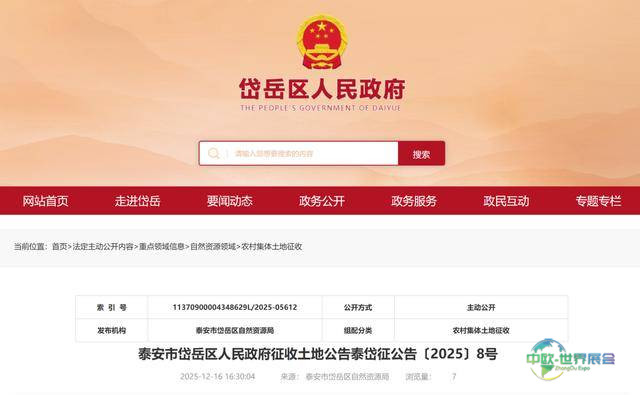 12月16日,岱岳区人民政府官网发布了泰安市岱岳区人民政府的征地公告,文号为泰岱征公告〔2025〕8号,具体内容如下: