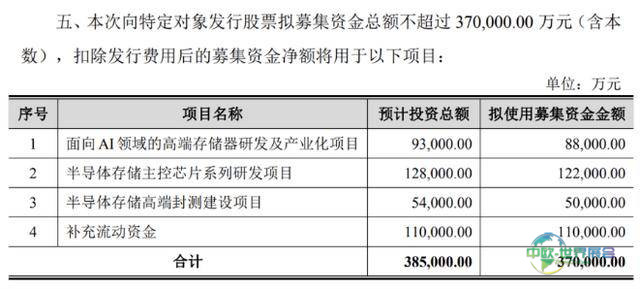 根据定向增发预案,在扣除发行费用后,江波龙计划将8.8亿元投入面向人工智能领域的高端存储器研发及产业化项目(以下简称项目一)、12.2亿元投入半导体存储主控芯片系列研发项目(以下简称项目二)、5亿元投入半导体存储高端封测建设项目(以下简称项目三),剩余的11亿元则用于补充流动资金。