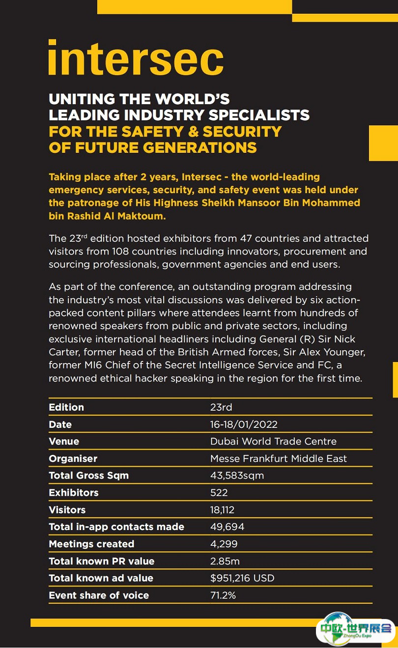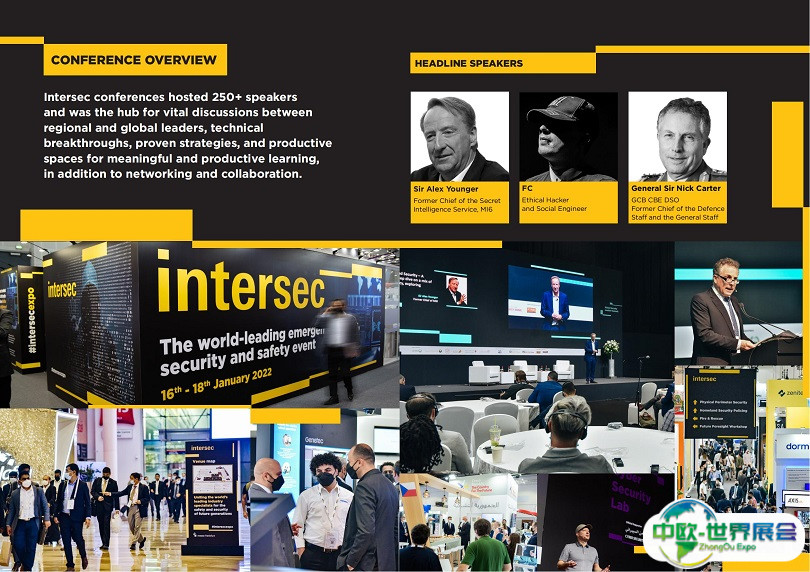 中欧国际多次组织了部分优质企业参展!中东迪拜安防及消防展览会(INTERSEC)同期将举办多场高规格会议,包括国际安全领袖峰会、消防与救援大会、健康与安全会议、门禁控制论坛等。议题将涵盖AI在警务中的应用、应急响应预测分析、高风险作业人员防护、智慧基础设施安全等前沿方向。