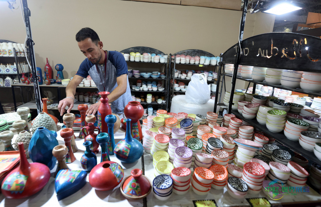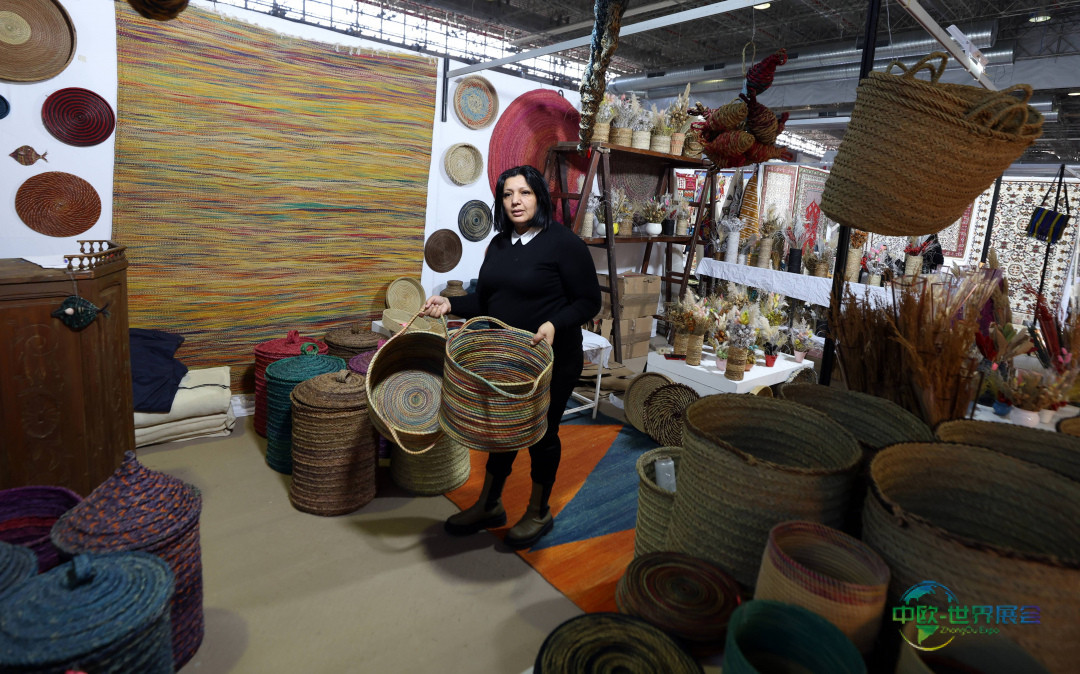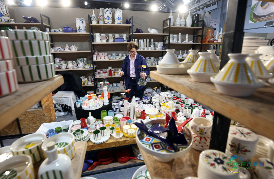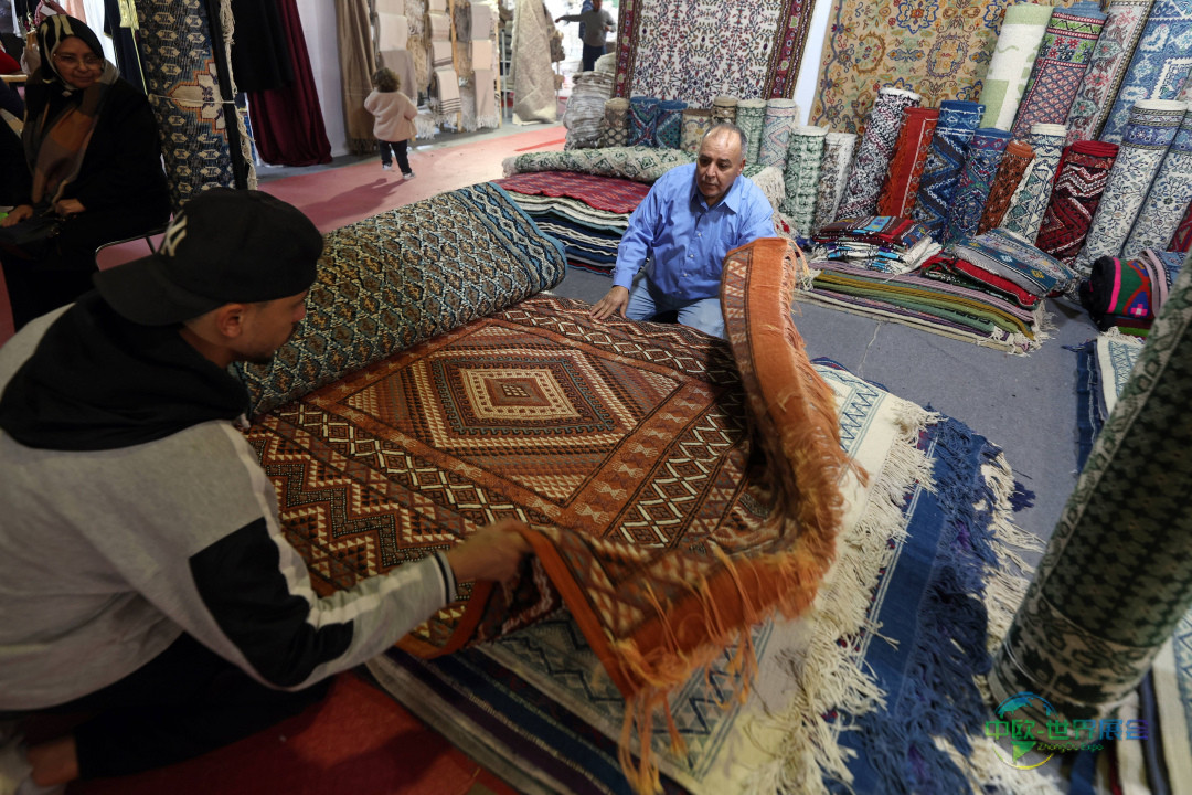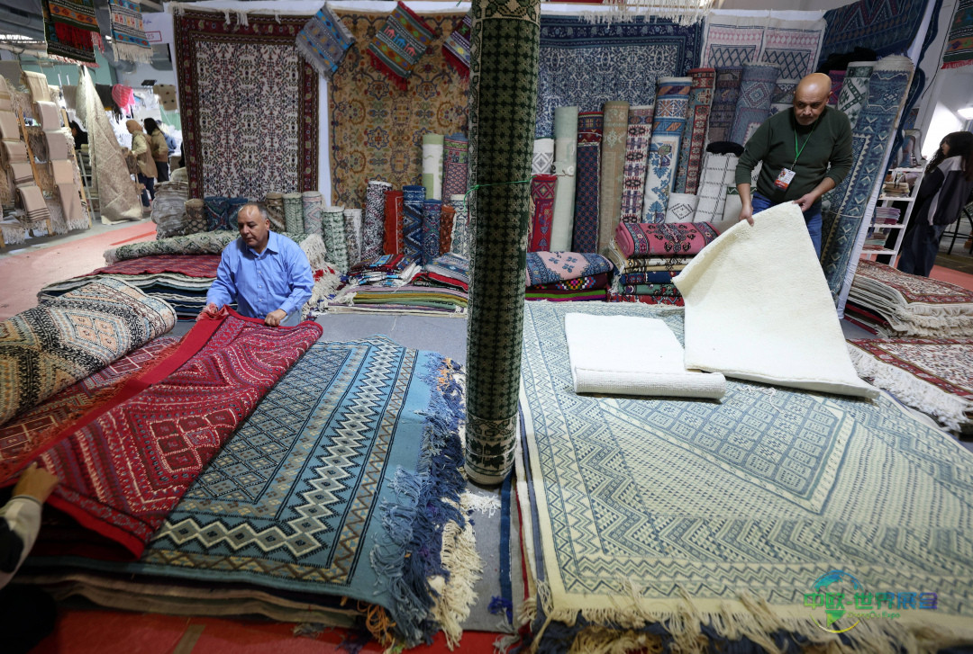 12月23日,在突尼斯首都突尼斯市克拉姆展览中心进行的第四届国家地毯与传统编织展上,一名手艺人正在摆放其作品。 新华社/欧新