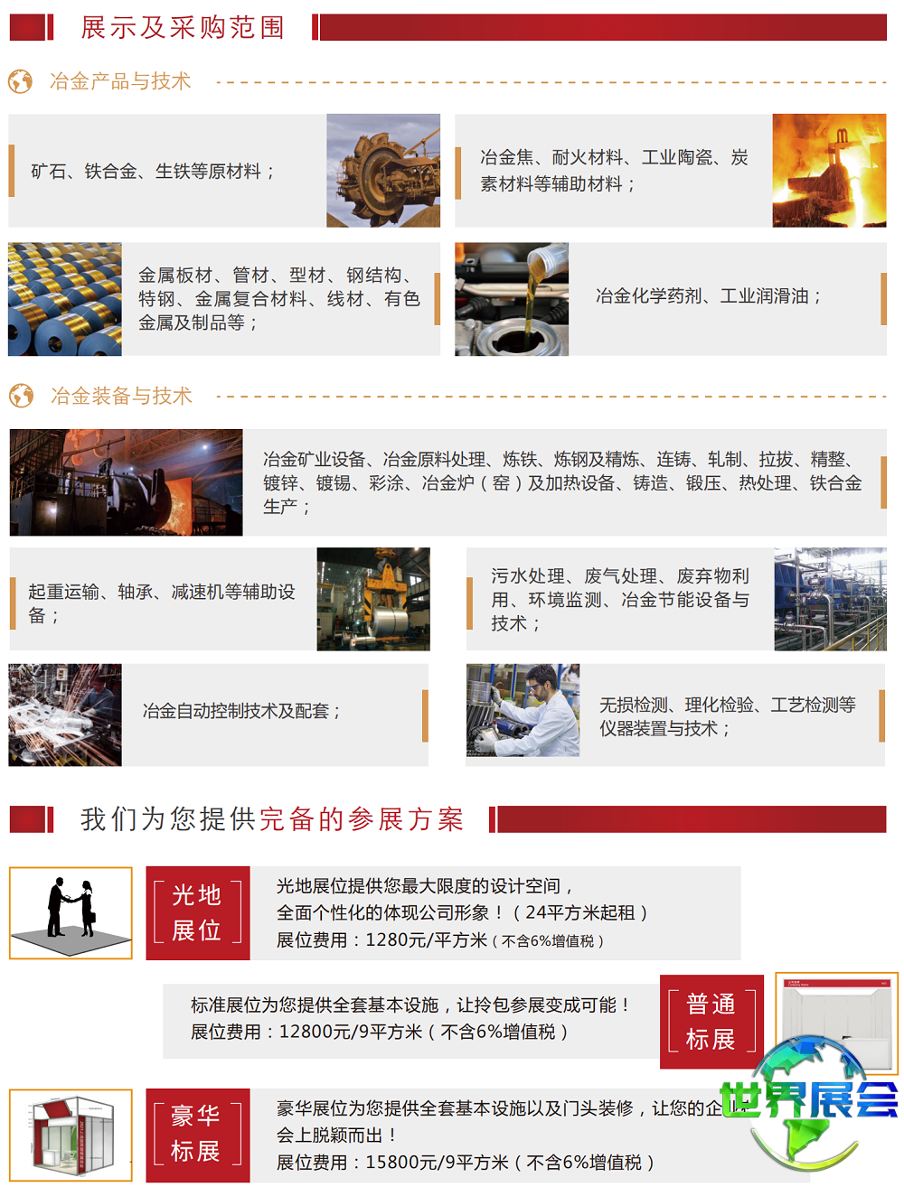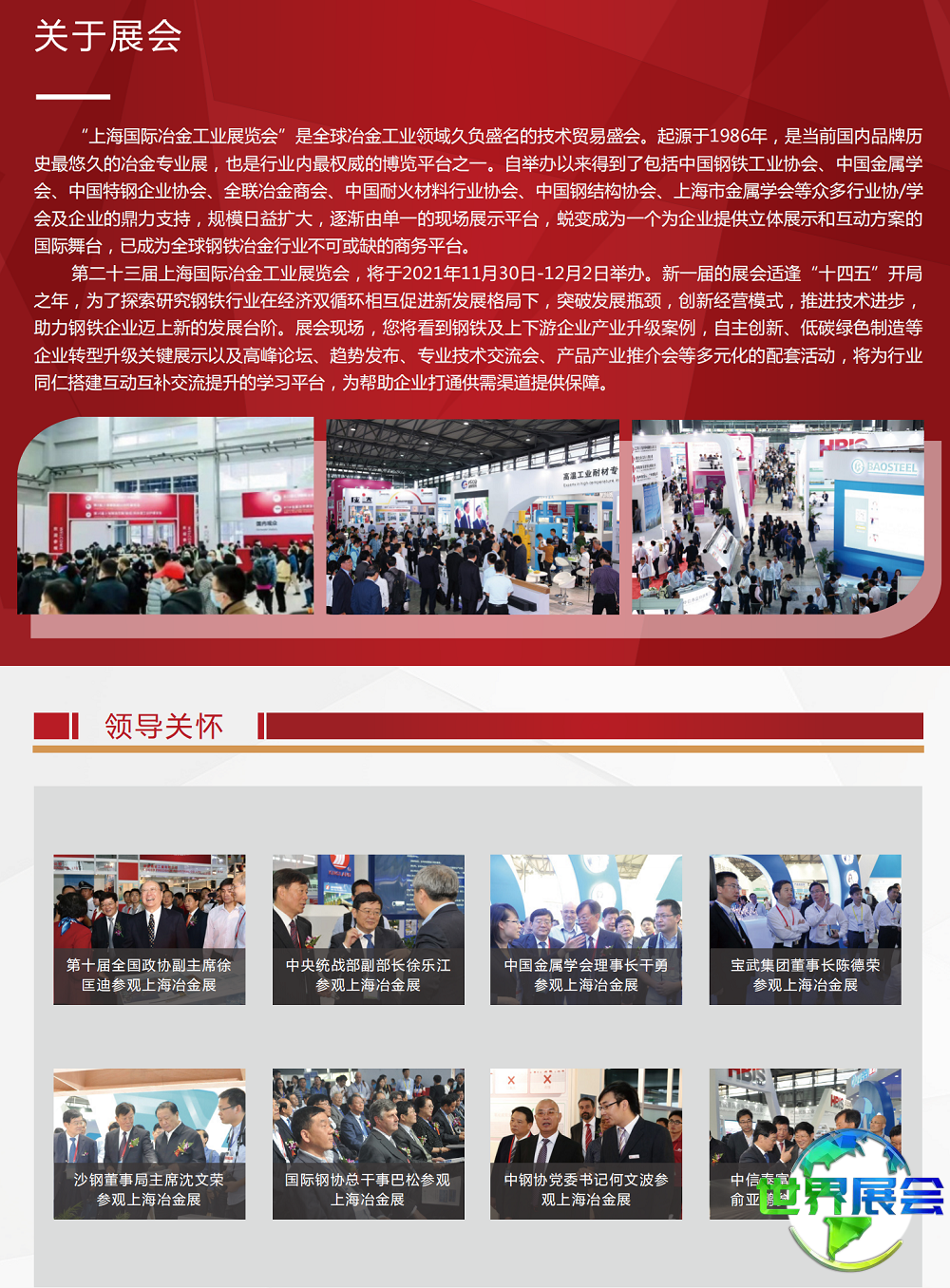 上海国际冶金工业博览会(MTM)是金属世界博览会的关键板块,始于1986年。作为在中国境内创办最早、历程最长的钢铁冶金领域专业展览会。在包括原冶金工业部、中国钢铁工业协会、中国金属学会、全国工商联冶金业商会、中国特钢企业协会、中国钢结构协会、中国耐火材料行业协会等众多机构的持续协助下。它与同期举行的耐火材料展、热处理精工展、钢管展、金属线材展、铸锻造展一起,形成了国内钢铁产业链中最具影响力的展会平台之一。