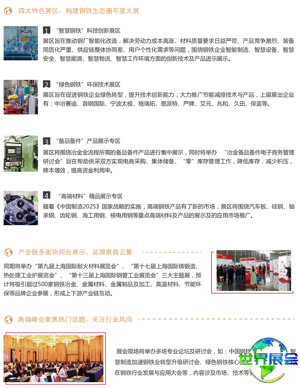 本届上海国际冶金工业博览会(MTM)旨在强化原材料、成品与装备企业间的协同合作,畅通供应链,推动共同发展,延续其平台一贯的特色——覆盖行业“全品类”,将吸引海内外大量知名企业前来参展。