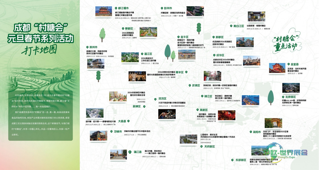 12月27日,据成都市经信局市新经济委透露,成都“村糖会”元旦春节系列活动的游览地图已正式发布,崇州天府酒村的村糖集市、郫都的村厨比拼、都江堰的“天府珍水”特色商品市集……元旦与春节假期期间,成都各个区(市)县的“村糖会”将陆续展开,每一处都充满亮点。