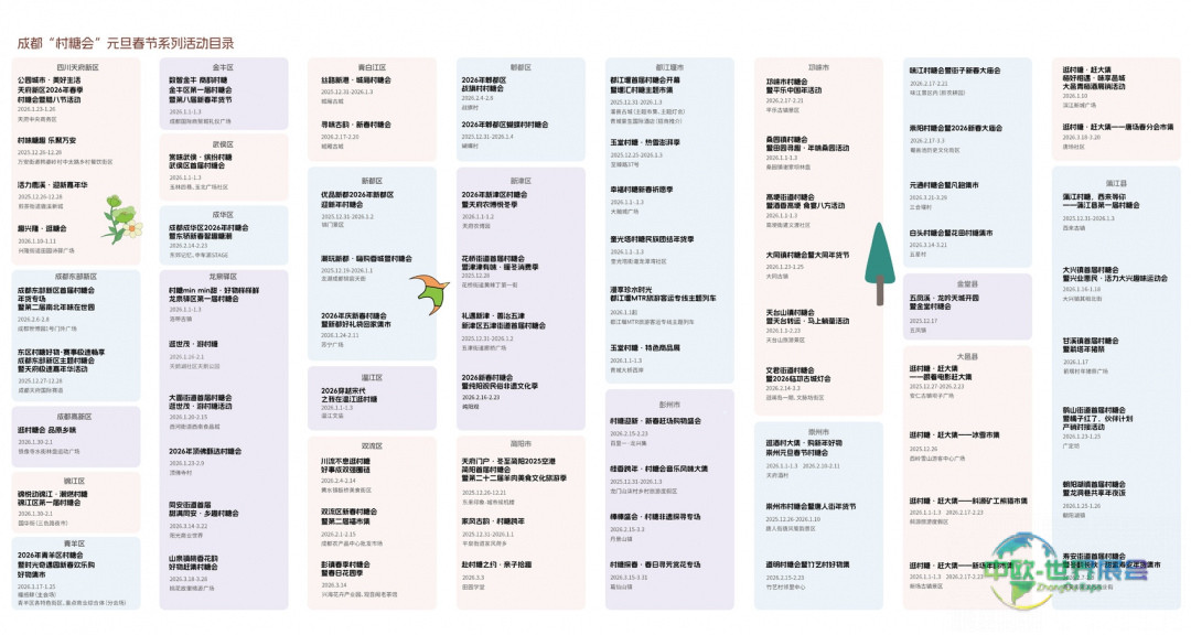 春节期间的安排同样引人入胜,邛崃市将开展“邛崃市村糖会暨平乐中国年”活动,地点在平乐古镇景区;彭州市将组织“村糖迎新·新春赶场购物盛会”,地点位于百里一·龙兴集;成华区将举行“成都成华区2026年村糖会暨东骄新春智趣糖潮”活动,地点设于东郊记忆、中车源STAGE。