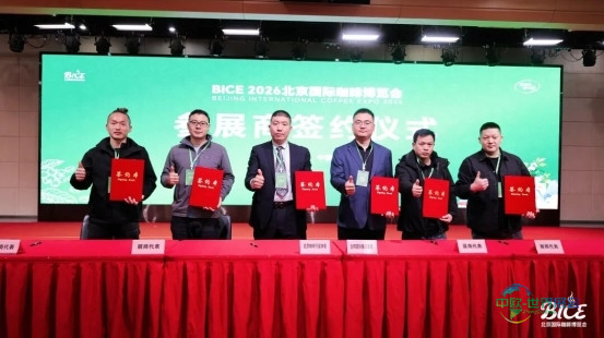 在参展商签约环节,十多家已确定合作意向的领军展商代表上台完成签约,这充分体现了行业对BICE 2026北京国际咖啡博览会的高度认同与坚定支持。