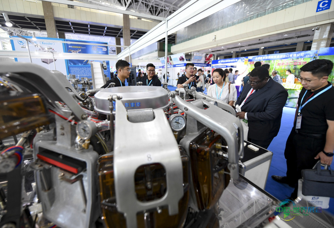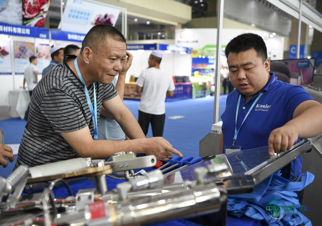 7月14日,采购商在博览会现场咨询肉类加工设备的相关信息。新华社记者 冯开华 摄
